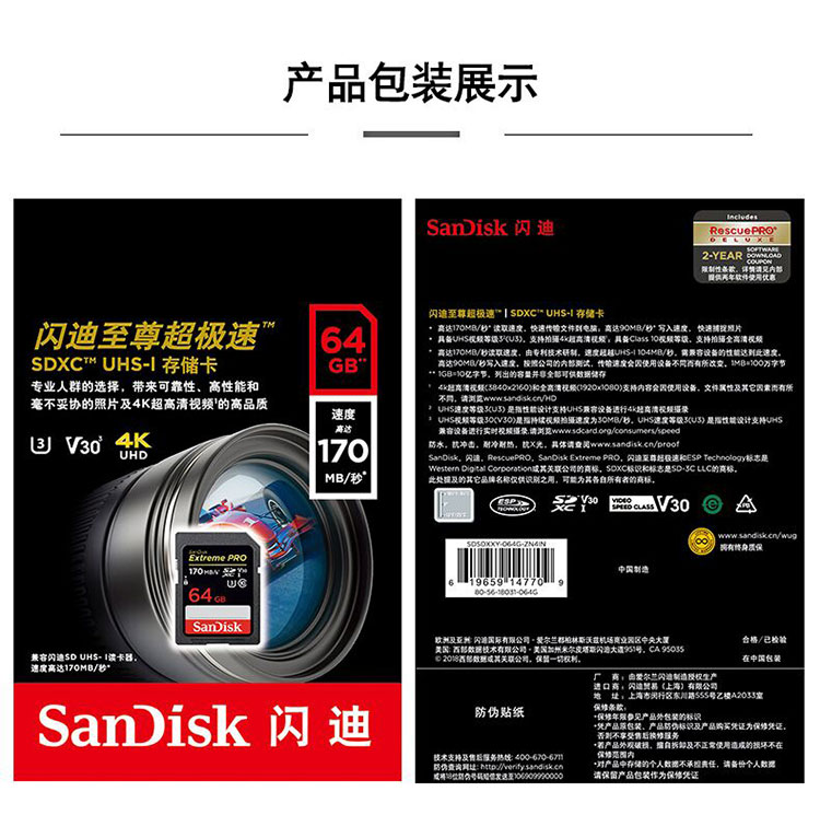 闪迪(SanDisk)64GB SD存储卡 U3 C10 V30 4K 至尊超极速版内存卡 读速170MB/s 写速90MB/s 捕捉4K超高清