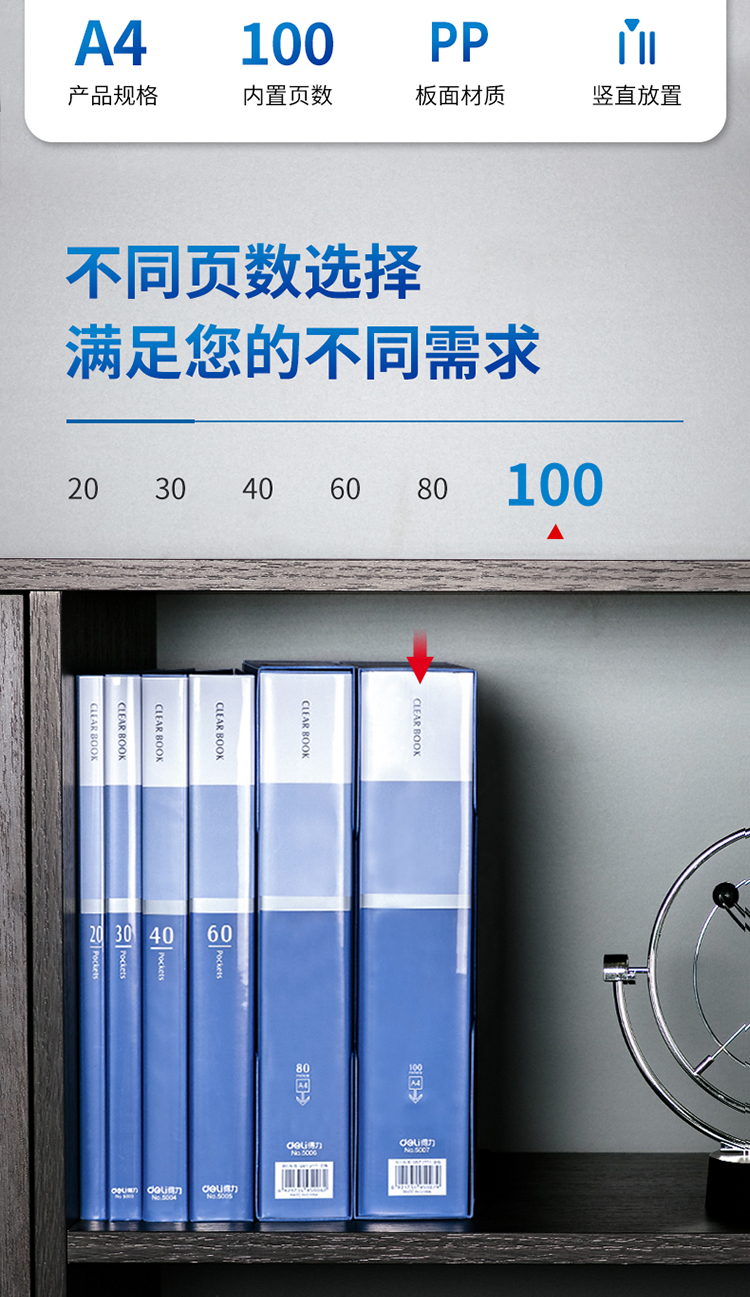得力 deli A4/100页大容量资料册插袋文件册活页文件收纳袋活页插袋文件夹票证收纳5007